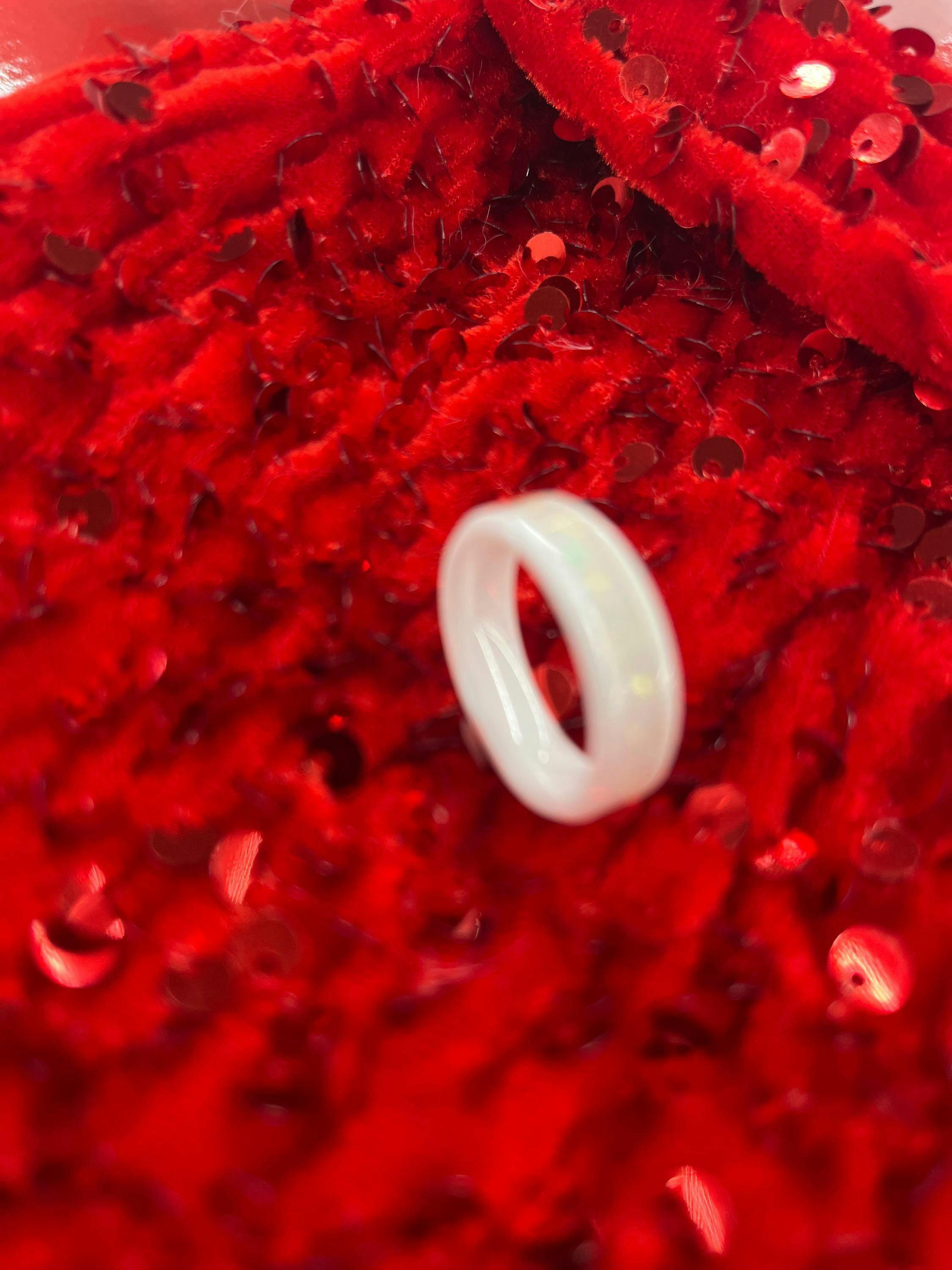 Take a pure white ceramic ring, fill it to the brim with Opal that has a delicate pink hue as well as pink glow powder and what else could you name it besides 'Cherry Blossom'? No seriously, I've got no clue what i could name this. Weigela? Honeysuckle? Bah it doesn't matter because the name 'Cherry Blossom' is perfect, just like the ring itself!
